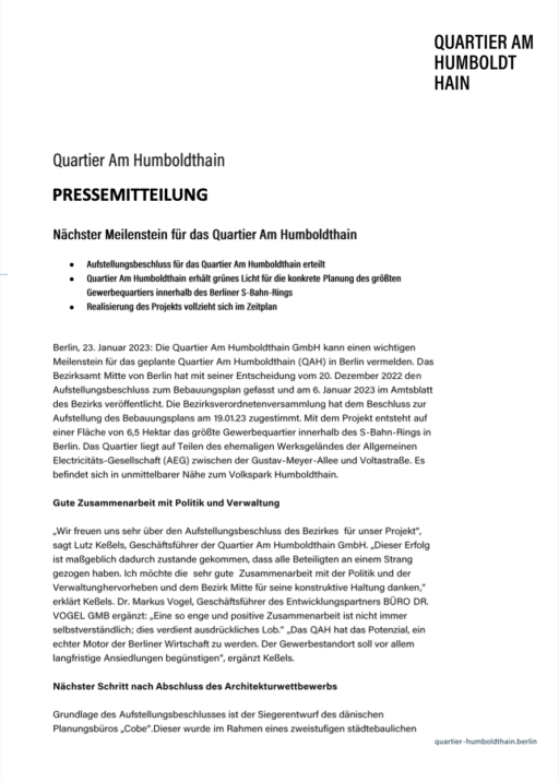 „Wir freuen uns sehr über die Erteilung des Aufstellungsbeschlusses für unser Projekt. Dieser Erfolg ist maßgeblich dadurch zustande gekommen, dass alle Beteiligten an einem Strang gezogen haben. Ich möchte die sehr positive Zusammenarbeit mit der Politik und Verwaltung hervorheben und dem Bezirk Mitte für seine konstruktive Haltung danken,“ erklärt Lutz Keßels, Geschäftsführer der Quartier Am Humboldthain GmbH.