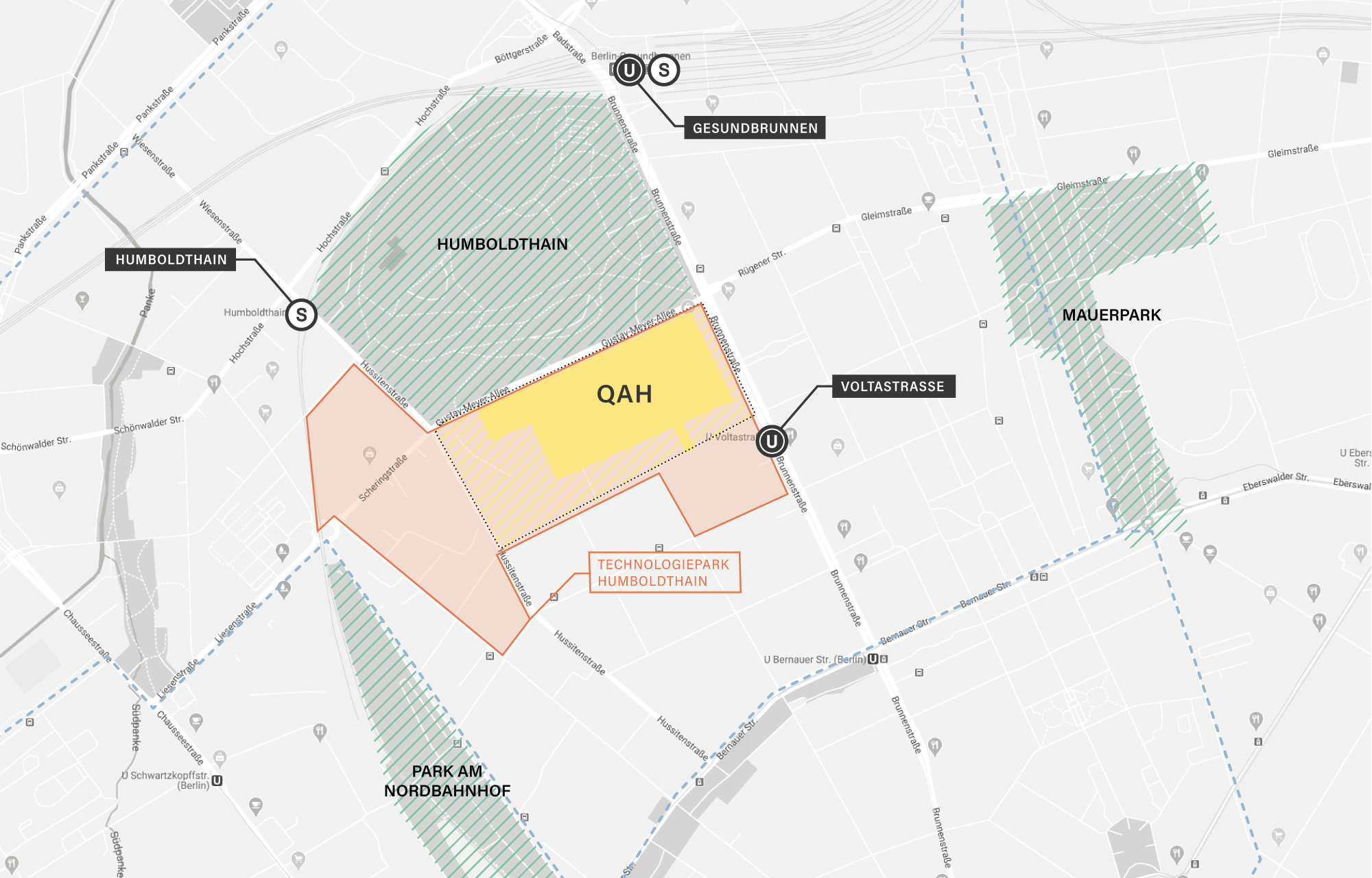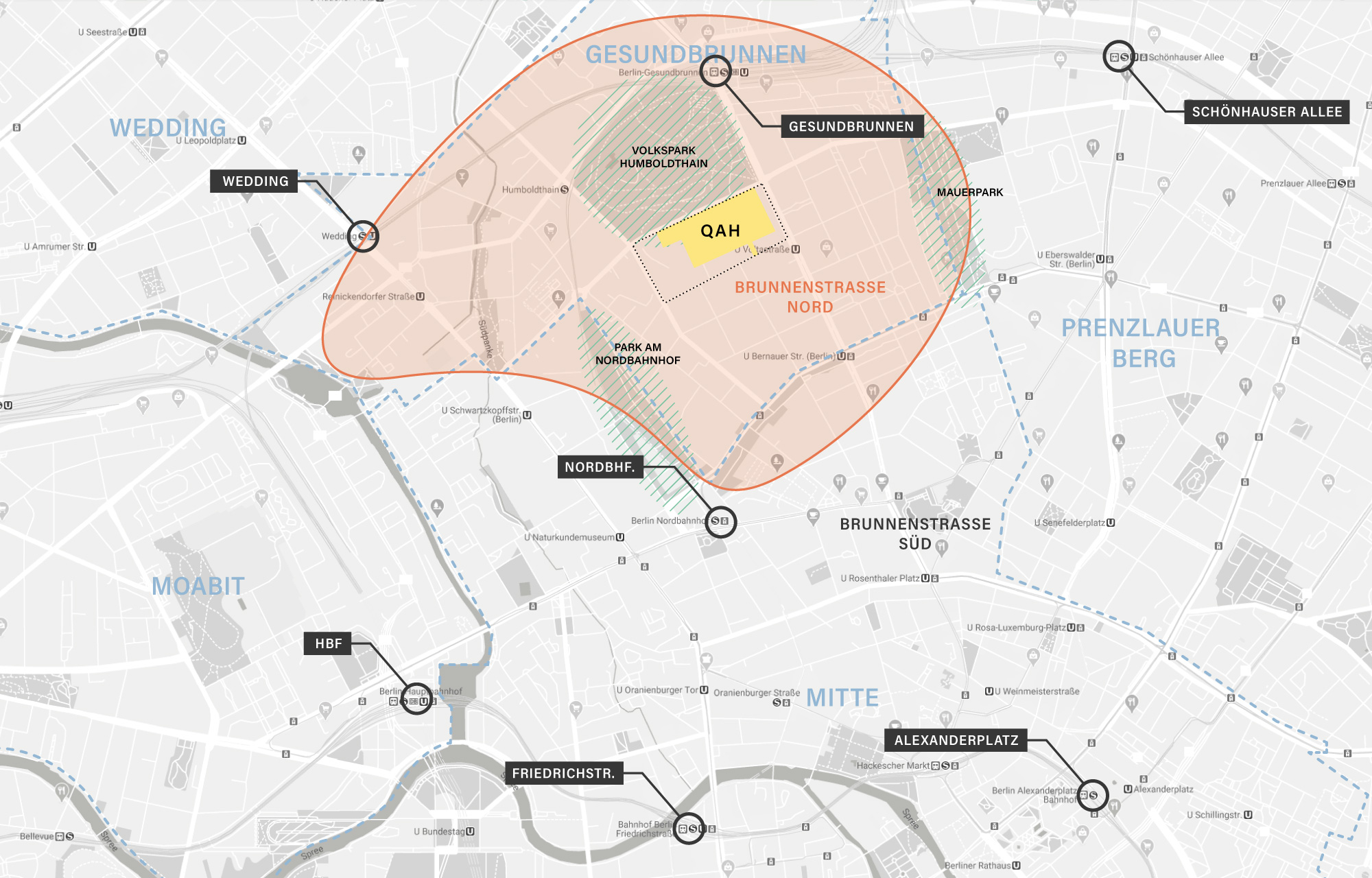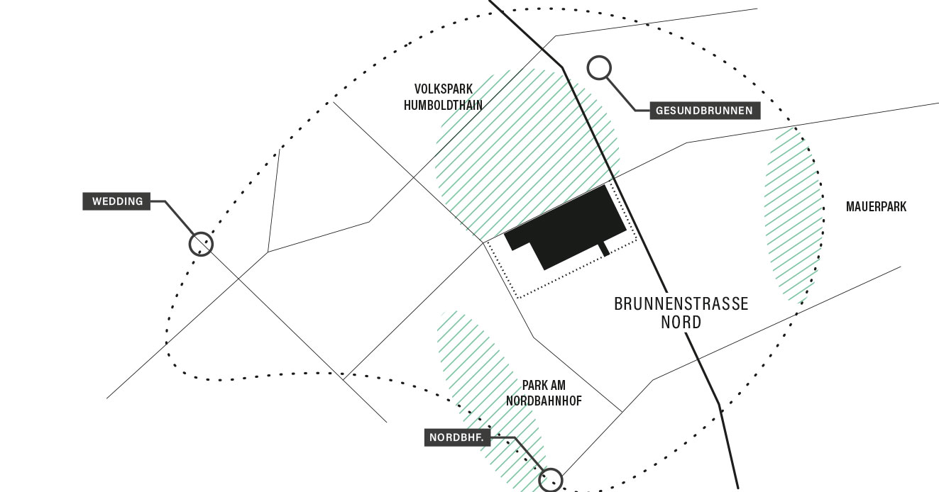 Das QAH befindet sich im Berliner Innenstadtbezirk Mitte, im Stadtteil Gesundbrunnen und somit in unmittelbarer Nähe zu den innerstädtischen Zentren der Hauptstadt.