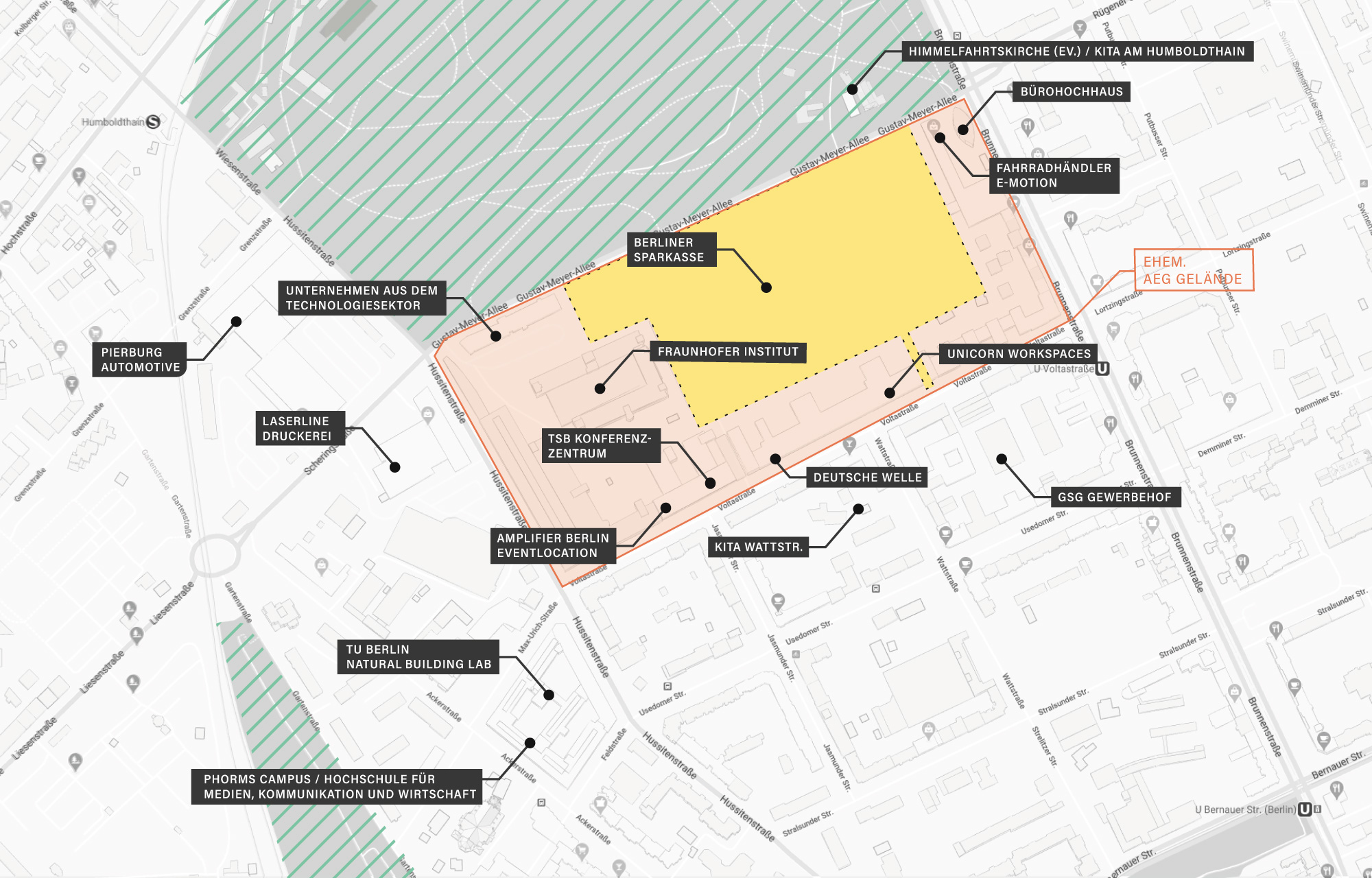 Das Quartier Am Humboldthain liegt auf dem ehemaligen Werksgelände der Allgemeinen Elektricitäts-Gesellschaft (AEG) am Humboldthain. Hiervon zeugen die denkmalgeschützten backsteinernen Industriebauten, die an das Grundstück angrenzen und in denen sich heute unter anderem Räumlichkeiten der TU Berlin und des Fraunhofer Instituts befinden.